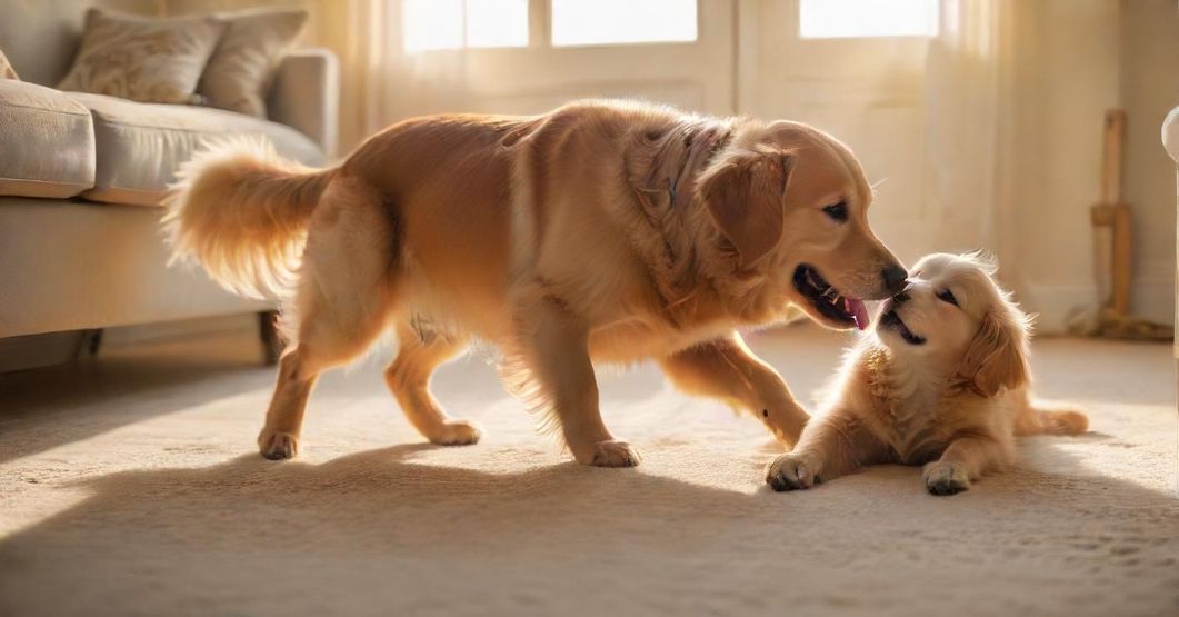A young child and a golden retriever are joyfully interacting in a sunlit living room, the dog performing the 'play dead' trick, lying on its side. Golden hour lighting, soft focus, depth of field, hyperrealistic textures.